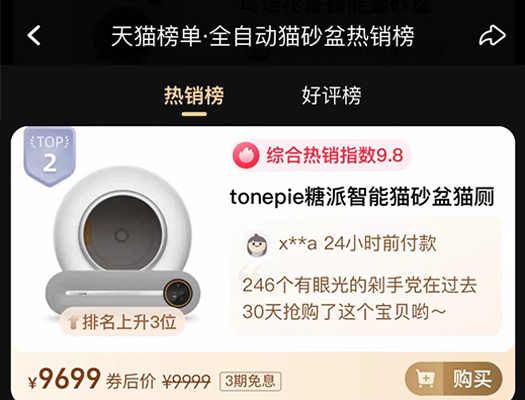 糖派首款智能硬件——Ti Pro智能猫砂盆,以业内首创的“桶仓一体”不夹猫安全结构,于天猫“315”专场亮相首发!上架不到10分钟,首批300台现货一抢而空,并快速攀升至天猫智能猫砂盆热销榜前三。